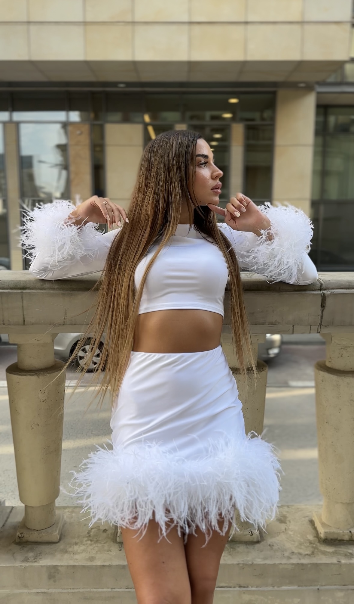 Komplet Megan to oszałamiająca kreacja, która składa się z krótkiej spódniczki i topu, tworząc niezapomniany zestaw pełen elegancji i wyrafinowanego stylu. Spódniczka, wykonana z wysokiej jakości dzianiny, emanuje luksusem, a jej dolną krawędź zdobią strusie pióra, nadając całej stylizacji niepowtarzalny charakter. Top również wykończony strusimi piórami, tworzy spójną całość, podkreślając finezję i dbałość o detale.
