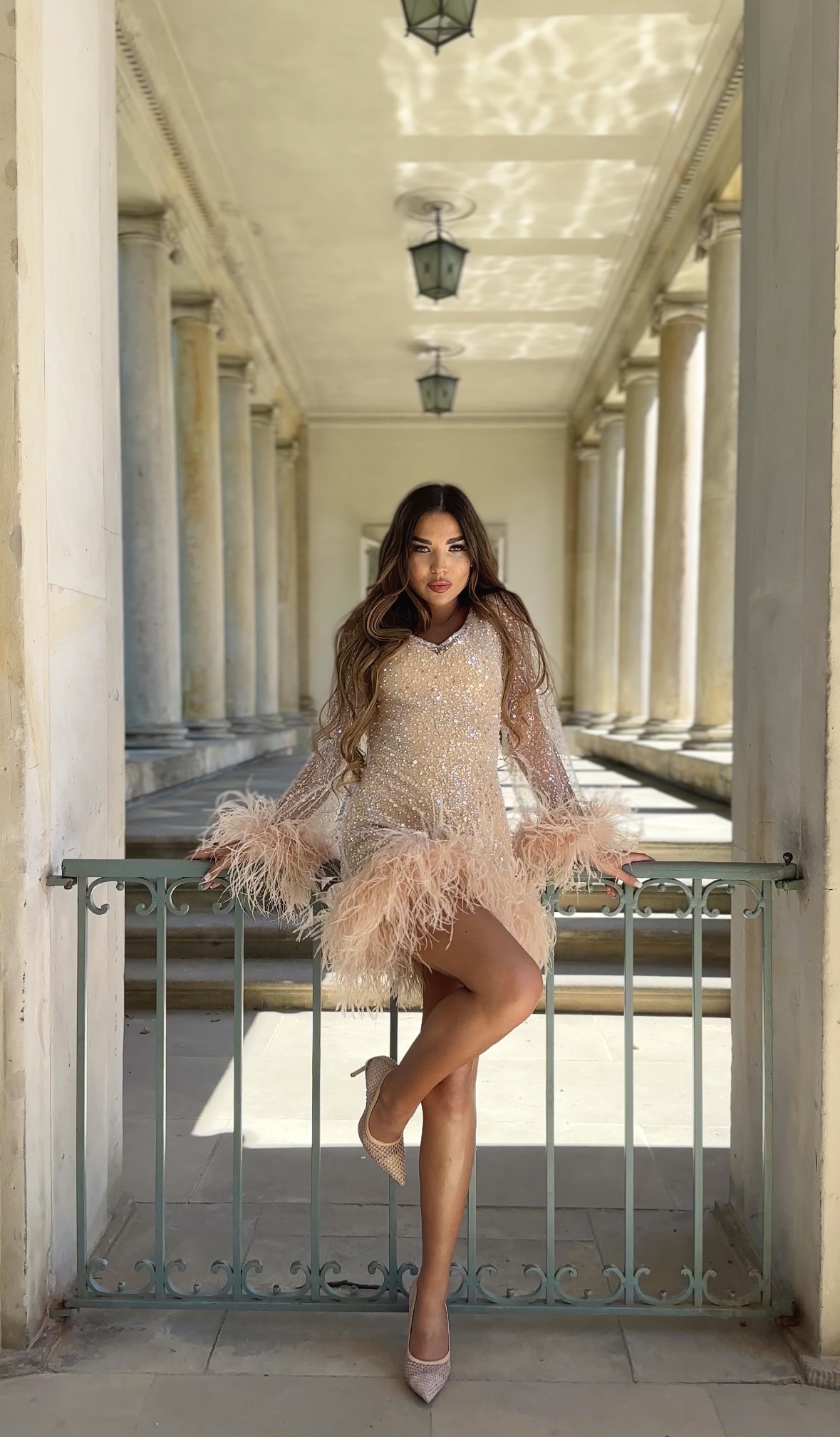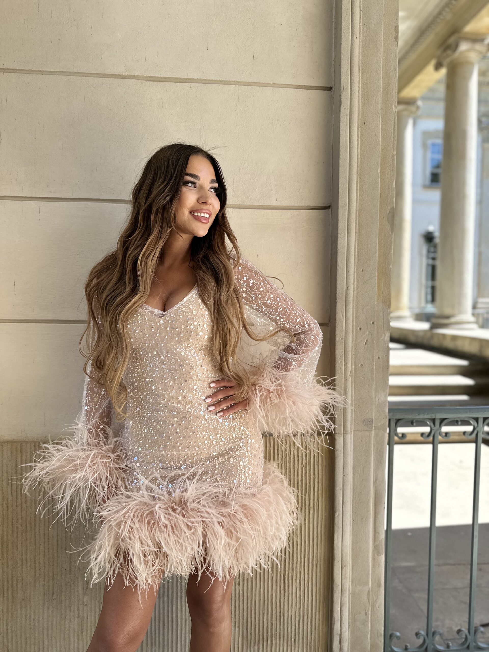Wspaniała sukienka , model Coco w kolorze szampańskim zachwyca elegancją i kobiecym wdziękiem. Jej krótka długość i długi rękaw tworzą harmonijną kompozycję, doskonale podkreślając subtelność każdej kobiety. Wyjątkowość tej kreacji podkreśla wykończenie strusimi piórami boa, dodając unikalnego uroku. Idealna na wyjątkowe wyjścia, ta sukienka emanuje stylem i klasą. Szampański odcień nadaje jej delikatności, a jednocześnie stanowi doskonałe tło dla piękna strusiego pióropusza.